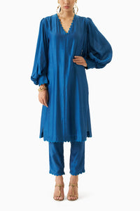 The perfect amalgamation of style & comfort, this royal blue set is a perfect option for festive occasion. Cut in silk fabric, it features a straight long kurta silhouette with exaggerated sleeves, V- neckline with scalloped details, hemline of kurta and pants are details with scallop radiating vibrance. It is pared with matching pants. Adorn a pair of statement earrings with this look.
