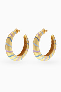 A curve of gleaming gold speckled with stripes of enamel in shades of cobalt blue and purple in patterns reminiscent of the majestic and rugged cliffs of Cinque Terre, our Lucia hoops make for a resplendent you!
