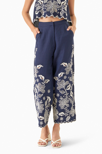 The Ma rlyn Pa nts, cra fted in a soft linen blend. The pa nts fea ture a bea utiful tropica l embroidery in ecru, but wha t ma kes this embroidery unique is Miri's cut work by ha nd. Pa ir it with the Ma rlyn summer ja cket or short shrug !