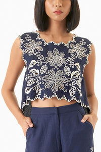 The Ma rlyn Short Shrug, cra fted in soft linen blend. This summer shrug fea tures tropica l embroidery in ecru with bea utiful cut work by ha nd. Wha t ma kes this shrug so versa tile is tha t it ca n be worn both front a nd ba ckwa rds. To complete the look, pa ir it with the Ma rlyn pa nts!