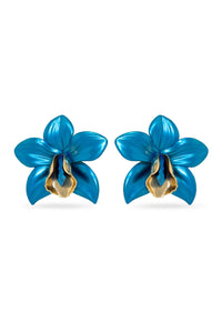 Elevate your style with the Valliyan Metallic Orchid Earrings in blue. Crafted from copper and brass, these bold orchid-inspired earrings feature a sleek metallic finish, enhanced by luxurious 22k gold or white rhodium plating—perfect for adding vibrant sophistication to any outfit.