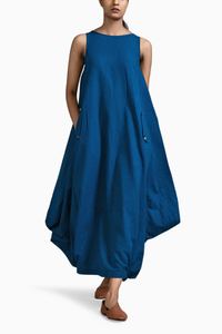 Our Classic side cowl dress with elastic at the hem, boatneck and front pocket. Team it up with trench Koza Jacket from our collection to complete the look.