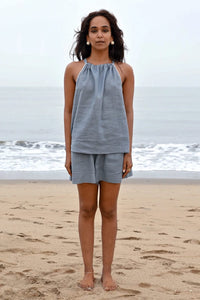 Introducing the Noir Halter Tie-Up Top, a relaxed-fit piece that combines comfort and style. This chic top features a stylish tie-up design and beautiful embroidery around the armholes, adding a touch of elegance paired with Odessa Elasticated Shorts, designed for comfort and style. These wide-legged shorts feature an elasticated high waist for a perfect fit and convenient side pockets