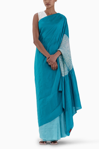 Featuring handwoven handsfree silk saree dyed in blue ombre with an elaborate shibori sleeve detail on the pallav. It comes with an unstitched blue silk blouse piece.