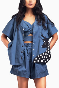 Blue Oversized Cuban Collared Shirt Co-ord Set With Patchwork Detailing
