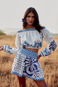The must-have of the season. Rosa is a top with elastic at the top and bottom, allowing you to bare your shoulders if you wish and wear it as a crop top or not. Rosa gives you the choice. The sleeves are also elasticated, so you can adjust the length as you like. Paired with Pia, which is romantic, chic, and bohemian. With its smocked belt, it fits perfectly on all body shapes.