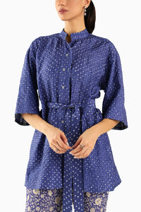 Featuring Blue Peplum Top by Twenty Nine India from Nisha Collection. Crafted from luxurious silk raidaana bandhani, it showcases wide sleeves, a high neck, and a pull-out belt for a flattering fit. Finishing details add a touch of sophistication to this exquisite design.