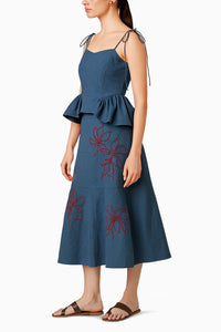 This sculptural yet soft set in washed denim-toned banana cotton pairs a structured peplum top with a dramatic paneled skirt. The top features a fitted bodice with princess seams, adjustable shoulder ties, and a circular cut-out at the waist that flows into a gathered peplum for organic volume. Paired with the flared skirt—adorned with hand-applied red floral embroidery—the look balances architectural shape with artisanal detail, offering versatility for both elevated and relaxed styling.