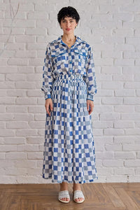 This co-ord set features a relaxed-fit shirt and a gathered skirt, both crafted from ultra-soft, hand-dyed cotton mul-mul with a naturally crinkled texture. Showcasing a hand-printed checkerboard design in soothing shades of blue, grey, and white, the shirt is styled with a classic collar, full button-down front, and functional flap pockets on the chest. The skirt offers a comfortable elasticated waistband and a flared silhouette that adds graceful movement. Ideal for casual outings, travel, or coordinated everyday styling.