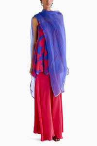 Featuring a digitally printed blue and coral kalidaar short kurta with sharara and dupatta.