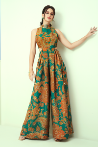 The Blue Printed Jumpsuit with Collar and Side Embellishments and Waist Cutout features a tailored collar that adds a sophisticated touch to its neckline. The side embellishments enhance the waistline, creating a flattering silhouette that emphasizes the figure. The waist cutout detail adds a hint of allure and modern flair, offering a stylish twist to the ensemble. Crafted from a printed fabric in a serene blue hue, the jumpsuit offers both comfort and style.