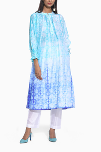 The shades of blue and purple can never go wrong! Bring a new vibe to your festivity with our Blue Purple Ombre Shibori Tunic. It is embellished with beautiful gold sequin work. The tunic has round neckline with front gatherings.
