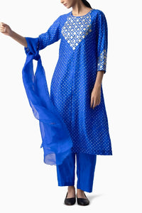 This Bandhani on pure silk kurta has a hand embroidered gota patti yoke. The work extends on the sleeves and back. It comes clubbed with silk pants and organza stole.