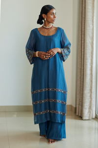 Featuring Blue Rekha Kurta Set by Sarang Kaur by Akaari Collection. This stylish ensemble in serene blue showcases Chanderi silk for both the kurta and pants. Perfect for those who appreciate traditional craftsmanship fused with contemporary elegance.