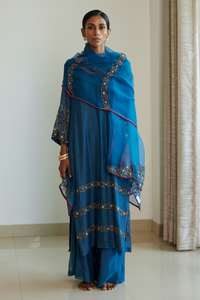 Featuring Blue Rekha Stole by Sarang Kaur by Akaari Collection. Crafted by luxurious organza silk in a soothing blue hue, this stole exudes elegance and sophistication. Perfect for adding a touch of refined charm to any outfit, ideal for both formal and casual occasions.