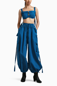 A set of well-fitted pocket corset with adjustable straps and elastic back with Baggy-fit cargo pants with side pockets and elastic back.