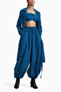 A set of well-fitted pocket corset with adjustable straps and elastic back with Baggy-fit cargo pants with side pockets and elastic back & an Over-sized Trench Jacket with elastic hem, side pockets and canvas belt.