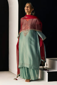 Featuring the Blue Sana Suit, a hand-embroidered ensemble with a kurta and pants tailored in tissue silk, paired with an organza silk dupatta. The dupatta is included with the set, completing this elegant and timeless look.