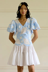 Featuring a V-neck and puffed short sleeves, the Blue Scallop Dress is a short, two-layered design. It highlights scalloped blue and white crochet detailing on the top, adding a delicate and stylish touch to this elegant summer dress.