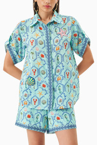 The seba stia n Coord set is Miri’s summer fun print - a pla y of flora l with na utica l motifs on a n a zure blue ba se - cool viscose-linen blend fa bric. The rela xed, loose-fitting shirt pa irs effortlessly with softly ela stica ted shorts OR pa nts , ensuring comfort in style. Borders with complimenta ry embroidery a re a ppliquéd on the shirt front a nd sleeves &a mp; silken threa d na utica l ba dges complete the pla yful Seba stia n Set.