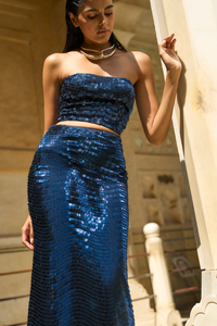 Bandeau bralette in a shimmering blue allover sequin embroidery. Single side sewn pipe bead sequins in a flattering wave pattern. Removable pad pockets. Zipper in the back. Garment is fully lined.