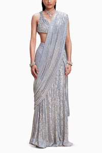 Embrace sophistication with Kangana Trehan’s misty grey sequins-embellished saree skirt. Merging contemporary elegance with feminine allure, this shimmering fabric and detailed 3D blouse highlight your grace, ensuring you radiate timeless charm.