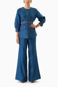 The perfect amalgamation of style & comfort, this royal blue set is perfect for a day out. Cut in cotton silk it features round neckline, elbow sleeves with cuffs, front pocket with pink and green anchor details radiating vibrance. It is paired with matching flared pants. Adorn a pair of statement earrings with this look.
