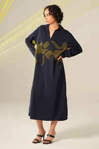 Featuring a relaxed-fit midi dress in deep navy, this piece is hand-textured with ombré Monet yellow PVC embroidery across the front and back bodice and sleeves. Side slits enhance fluid movement, while a soft collar with a front neck opening adds subtle elegance.