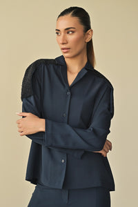 Featuring a blue shirt textured with hand-embroidered black PVC cord, this piece is finished with a sharp lapel collar, blending artisanal detail with contemporary structure.