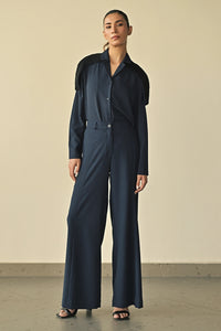Featuring a blue shirt textured with hand-embroidered black PVC cord, this piece is finished with a sharp lapel collar, blending artisanal detail with contemporary structure. Paired with high-waisted flared trousers, designed with a front seam, waistband cut-outs, and side pockets for a modern, tailored finish.