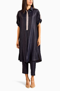 A blue lame two piece set featuring a long kurta with beadwork lace on the shoulders and placket. Paired with matching straight pants. .