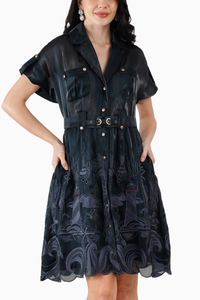 This is a shirt style dress with a front placket and contrasting gold buttons and pockets which give it a classic look that can be dressed up or down. The adjustable double buckle belt in gold finish allows you to cinch in the waist for a more flattering fit. Crafted from lightweight & flowy Silk Organza, the wave-like hem adorns the gigantic waves of our seas, replete with the Lighthouse atop the rocks, the seagulls flying across, the dolphin skimming by and the treasure chest of marine life.