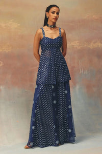 Featuring a strappy peplum top with a front opening, adorned with intricate mirrorwork and delicate beadwork on the straps, a playful yet elegant piece perfect for festive layering.