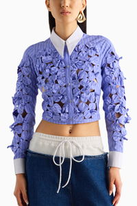 Featuring the Blue Stripe 3D Flower Shirt by MellowDrama's Utopia Collection. Made from 100% cotton, this cropped full-sleeve shirt showcases handcrafted 3D florals on the front and sleeves. It features a contrast collar and cuff, a front opening with buttons, and a tailored fit for a sophisticated and stylish appearance.