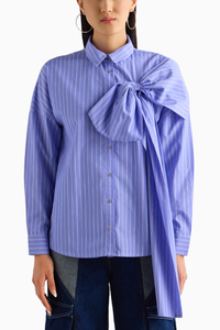 Featuring the Blue Stripe Bow Shirt by MellowDrama's Utopia Collection. This 100% cotton shirt features full sleeves with a bow detail, drop shoulders, a front opening with buttons, and a relaxed fit for effortless style and comfort.