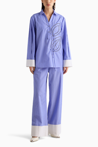 Featuring Blue Stripe Co-ord Set by MellowDrama from Utopia collection. Shirt crafted from 100% cotton with a front opening, embellished details, full sleeves, and contrast wide cuff. Paired with pants in the same fabric, featuring pull-on style, elasticated waist, side pockets, and ankle length for a relaxed fit.