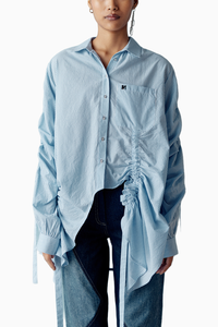 Featuring the Blue Stripe Gathered Shirt by Mellowdrama. Immerse yourself in the comfort of cotton, while the blue stripes and gathered design infuse elegance into your wardrobe effortlessly.