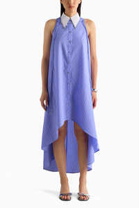 Featuring the Blue Stripe High Low Dress by MellowDrama's Utopia Collection. Made from 100% cotton, this sleeveless high-low shirt dress features a front opening with buttons, a contrast white collar, a crystal droplet embellished collar, tie detail at the shoulder, and a relaxed fit for effortless style and comfort.