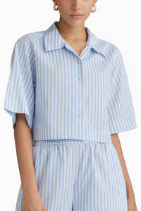 The cropped bowling shirt in blue and white stripes is crafted from a soft cotton and tencel blend, featuring mother of pearl buttons and an easy A-line fit with back yoke gathers, creating a breezy and modern silhouette ideal for everyday wear.