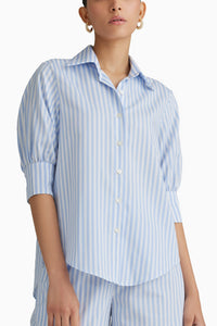 The short-sleeved shirt in blue and white stripes is crafted from a soft blend of cotton and tencel, featuring elbow-length sleeves with delicate pleats at the cuff, finished with mother of pearl buttons, and offered in both shorter and longer lengths, with the model wearing the shorter length for a refined, easy-going look.