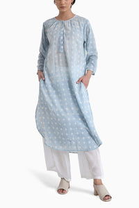 Featuring Blue Sunkissed Kurta with Pants by Jayati Goenka from Sunkissed Collection. Block printed Cotton long classic kurta paired with soft finishhed cotton silk like white trousers with pockets. The tunic and the trousers is minutely detailed with handwork in golden thread and by signature handmade buttons.