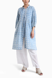 Featuring Blue Sunkissed Layer Co-ord Set by Jayati Goenka from Sunkissed Collection. A classic three-piece Block printed soft cotton set for all-day occasions. Long robe paired with no sleeve top and soft cotton printed trousers with pockets. Each piece is minutely detailed with handwork in golden thread and by signature handmade buttons.