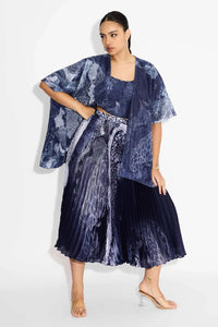 Featuring Blue Swirl Co-ord Set by Shasha Gaba, this obsidian blue ensemble includes a sequin coverup, corset, and pleated satin skirt. Crafted in transparent poly sequin and poly satin, it offers a perfect blend of shimmer and elegance for pret wear with a bold Indo Western flair.