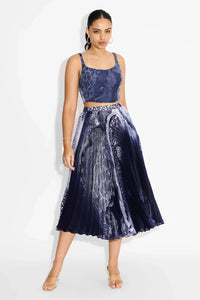 Featuring Blue Swirl Corset and Skirt Set by Shasha Gaba, this obsidian blue co-ord pairs a shimmering transparent poly sequin corset with a flowing poly satin pleated skirt. Perfect for pret wear, it blends bold Indo Western glamour with graceful movement for a striking ensemble.