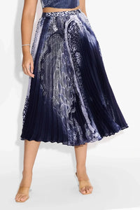 Featuring SHA Blue Swirl Pleated Skirt by Shasha Gaba, this obsidian blue skirt is made from smooth poly satin, offering a fluid silhouette with elegant pleats. Ideal for pret wear, its subtle swirl design adds a refined Indo Western touch to both casual and festive looks.