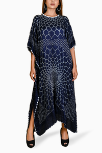 Step into timeless elegance with our exquisite Kaftan with 3 flowers in the Bandhani pattern. The handmade silk buttons along the neckline add a touch of sophistication, making this piece a perfect blend of tradition and contemporary style.