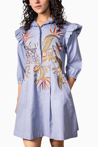 Featuring the Blue Tropical Embroidered Dress by Kukoon Label. Crafted from Egyptian Cotton in a serene blue hue, it boasts a comfortable fit and intricate hand and machine embroidery with tropical motifs. This dress is a singular component, perfect for adding a touch of exotic charm to your wardrobe.