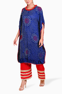 Elevate your style with our exquisite Bandhani Kaftan featuring flower motifs. The coin tassel neck details add a touch of bohemian charm, making this piece a perfect blend of tradition and contemporary fashion.