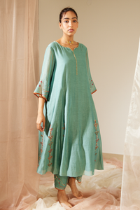 Featuring Blue Vrinda Kurta Set by Sarang Kaur from Gulaal Collection. This ensemble in serene blue features exquisite Chanderi silk for both kurta and pants. Perfect for those who seek elegance and comfort, blending traditional craftsmanship with contemporary style effortlessly.