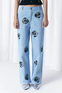 A perfect blend of vintage charm and modern edge, these washed denim jeans features intricate rose embroidery and embellishments for a striking look.